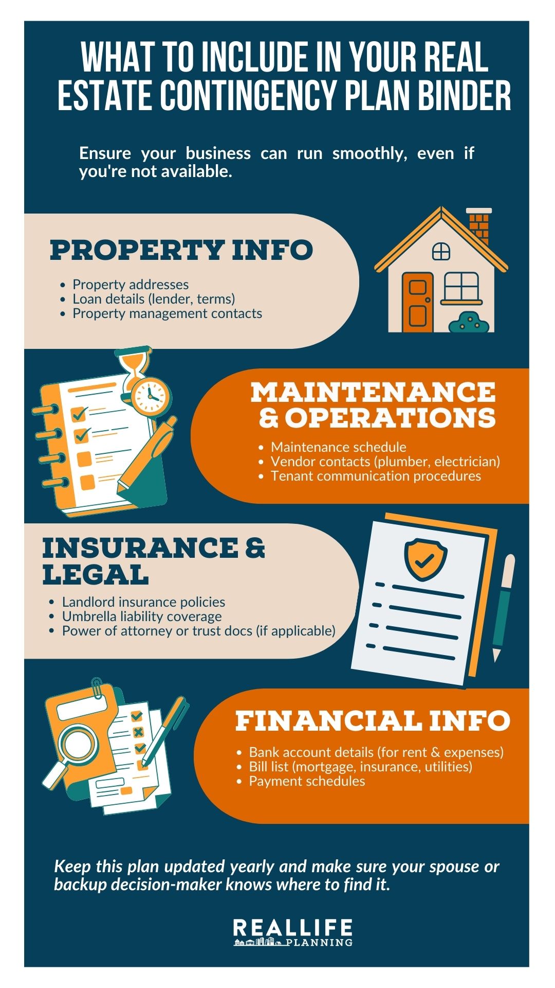 One important part of a real estate contingency plan is that it’s written. It doesn’t have to be anything fancy, but it does have to be written down and shareable with the person who will take over if you are injured, incapacitated, or otherwise unavailable.